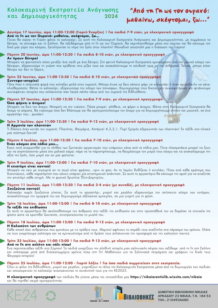 Σε ένα συναρπαστικό ταξίδι αναζήτησης…από τη Γη ως τον ουρανό, πραγματοποιώντας 12 δωρεάν παιδικές εκδηλώσεις με διαφορετικές θεματικές ενότητες προσκαλεί τους μικρούς φίλους της η Δημοτική Βιβλιοθήκη Νίκαιας από τις 17 Ιουνίου έως τις 25 Ιουλίου στο πλαίσιο της Καλοκαιρινής Εκστρατείας Ανάγνωσης και Δημιουργικότητας. Κεντρικοί άξονες των δράσεων είναι η γνώση, η επιστήμη, ο πολιτισμός αλλά και ο ίδιος ο άνθρωπος με σκοπό οι τοπικές βιβλιοθήκες να μετατραπούν σε κυψέλες εξερεύνησης και δημιουργικότητας.