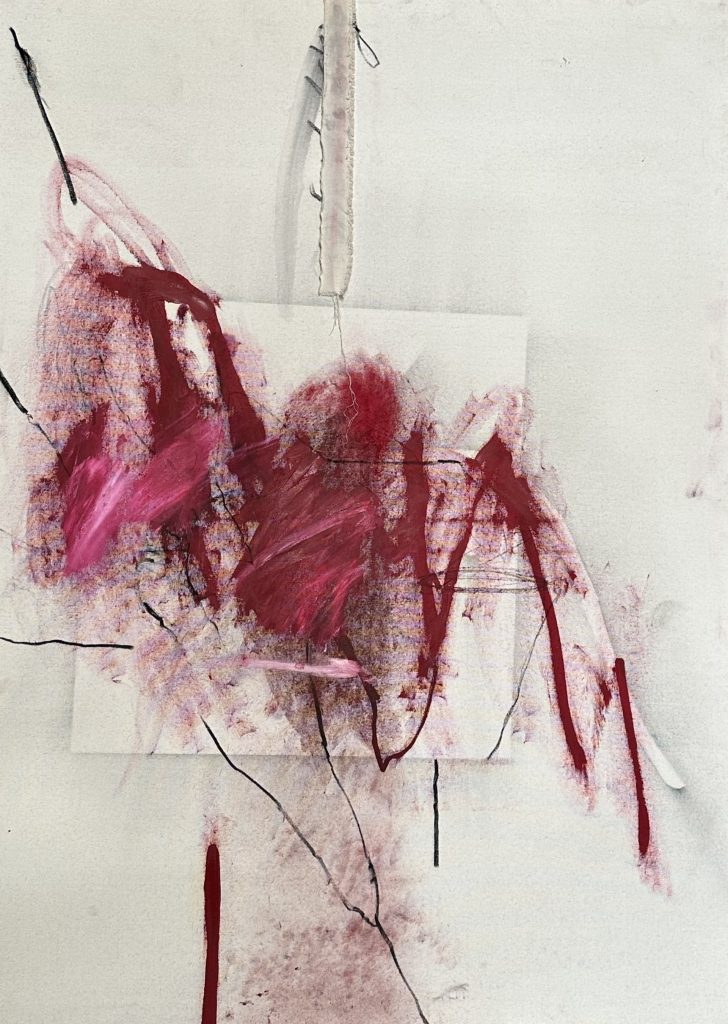 Η Ματίνα Σταυροπούλου αποδεσμεύεται από την μορφολογική υλοποίηση και καταγράφει συμπυκνωμένα χρωματικά γεγονότα που διαδέχονται τομές και παύσεις. Το χρώμα λειτουργεί συμβολικά σηματοδοτώντας έννοιες και συνέπειες. Ο αρχε-τυπικός συμβολισμός της γυναικείας μήτρας επεκτείνεται και μετατρέπεται σε αιμάσσουσα πληγή ενός ολόκληρου λαού.