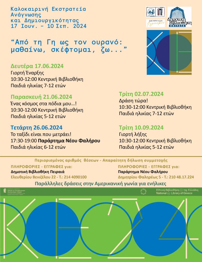 Σε ένα συναρπαστικό ταξίδι αναζήτησης, με σύνθημα: «Από τη Γη ως τον ουρανό: μαθαίνω, σκέφτομαι, ζω…», οι μικροί Πειραιώτες θα έχουν την ευκαιρία  να συμμετάσχουν δωρεάν σε δράσεις με διαφορετικές θεματικές, από τη Δευτέρα 17 Ιουνίου έως  και την Τρίτη 10 Σεπτεμβρίου 2024.