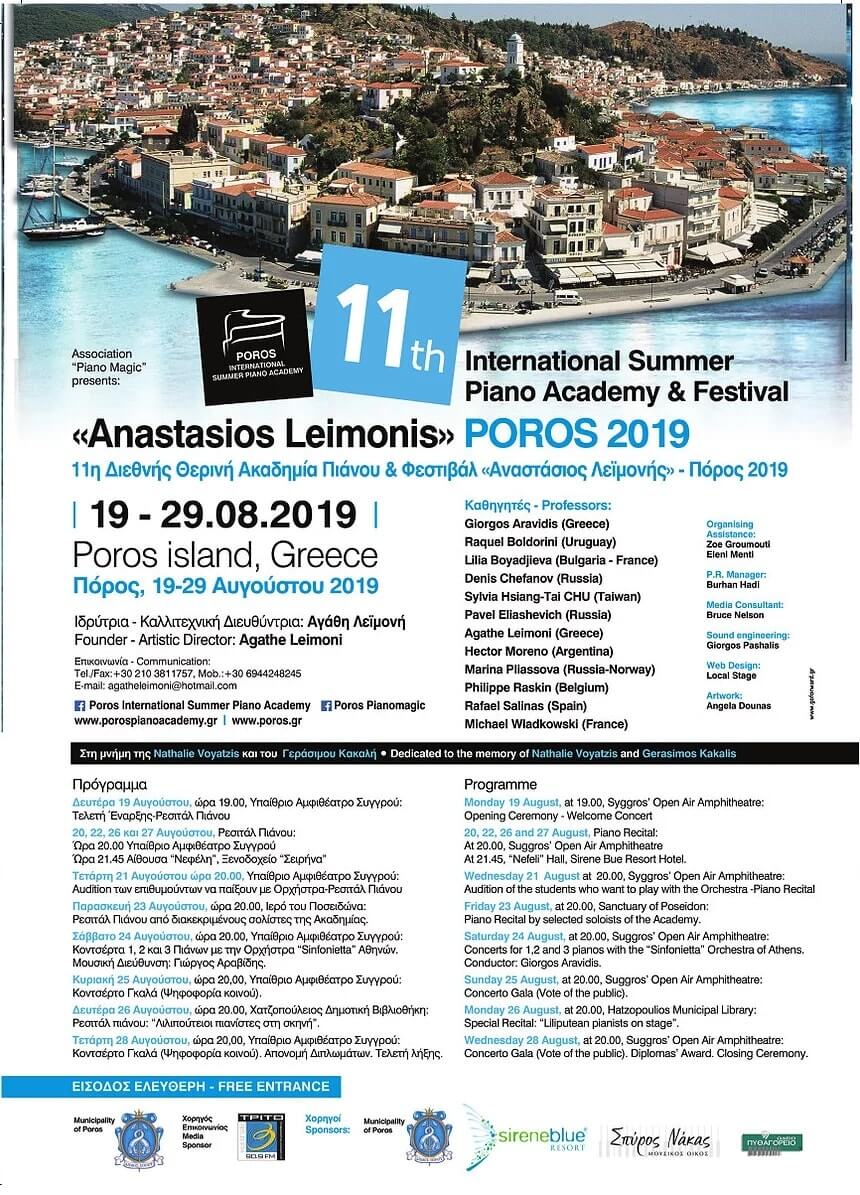 Ξεκίνησε τις εργασίες της η Διεθνής Θερινή Ακαδημία και το Φεστιβάλ Πιάνου «Αναστάσιος Λεϊμονής, τα οποία πραγματοποιούνται για 11η συνεχή χρονιά στον Πόρο και διαρκούν από τις 19 μέχρι τις 28 Αυγούστου 2019.