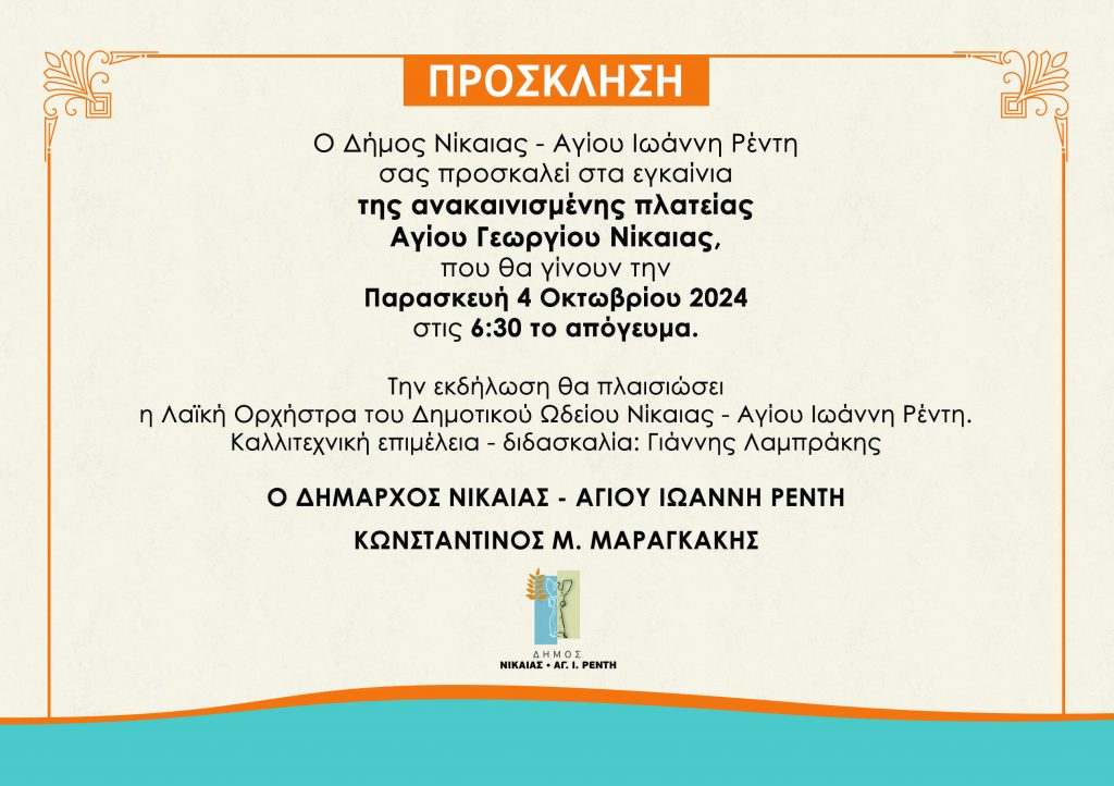Ολοκληρώθηκαν οι εργασίες ανάπλασης της πλατείας Αγίου Γεωργίου στη Νίκαια και τα εγκαίνια θα πραγματοποιηθούν την Παρασκευή 4 Οκτωβρίου στις 6.30 μ.μ. Η νεα πλατεία με περισσότερους χώρους πρασίνου, νέες υποδομές και βελτιωμένη αισθητική, δημιουργήθηκε για να προσφέρει σε όλους έναν χώρο ψυχαγωγίας και κοινωνικής συναναστροφής. Την εκδήλωση θα πλαισιώσει η Λαϊκή Ορχήστρα του Δημοτικού Ωδείου Νίκαιας – Αγίου Ιωάννη Ρέντη.