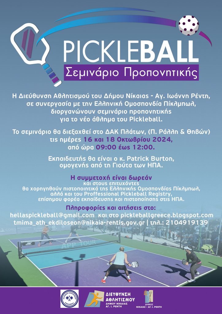 Δωρεάν Σεμινάριο Προπονητικής για το νέο άθλημα του Pickleball, διοργανώνει η Διεύθυνση Αθλητισμού Δήμου Νίκαιας – Αγ. Ιωάννη Ρέντη σε συνεργασία με την Ελληνική Ομοσπονδία Pickleball στο Δημοτικό Αθλητικό Κέντρο «ΠΛΑΤΩΝ» (Π. Ράλλη & Θηβών) στις 16 και 18 Οκτωβρίου από τις 9.00 π.μ- 12.00 μ.μ. Εκπαιδευτής θα είναι ο κ. Patrick Burton, ομογενής από τη Γιούτα των ΗΠΑ. Στους επιτυχόντες