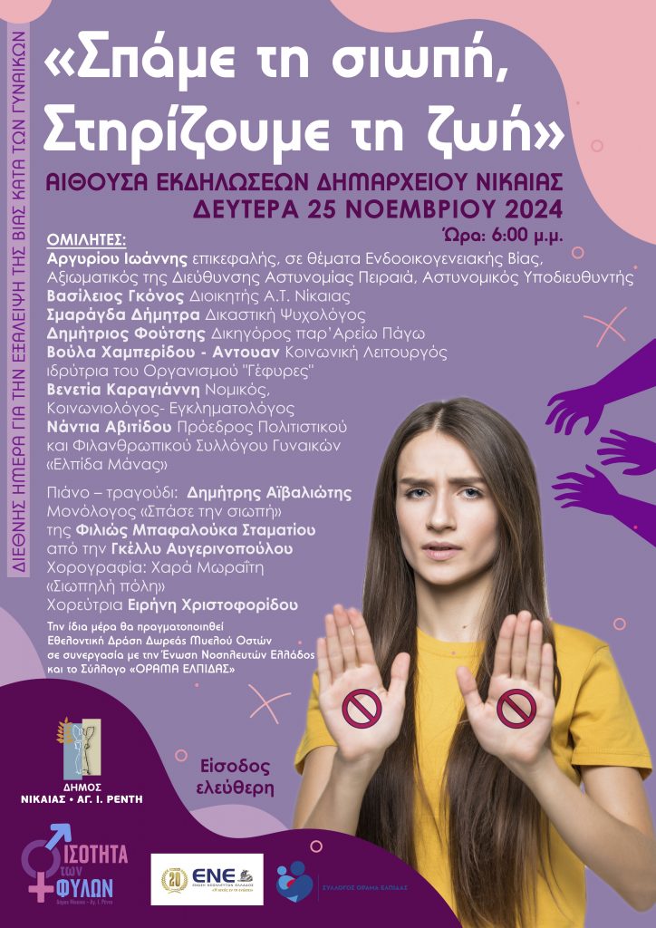 Με αφορμή τη Διεθνή Ημέρα για την  Εξάλειψη της Βίας κατά των Γυναικών, ο Δήμος Νίκαιας- Αγ.Ι. Ρέντη και η Επιτροπή Ισότητας των Φύλων, διοργανώνουν εκδήλωση ευαισθητοποίησης και ενημέρωσης με θέμα «Σπάμε τη σιωπή, Στηρίζουμε τη ζωή»   τη Δευτέρα 25 Νοεμβρίου στις 6.00 μ.μ. στην αίθουσα εκδηλώσεων Δημαρχείου Νίκαιας (Π. Τσαλδάρη 10 , 1ος όροφος).  Κατά τη διάρκεια της εκδήλωσης θα πραγματοποιηθεί Εθελοντική Δράση Δωρεάς Μυελού Οστών  σε συνεργασία με την Ένωση Νοσηλευτών Ελλάδος και τον Σύλλογο «ΟΡΑΜΑ ΕΛΠΙΔΑΣ».