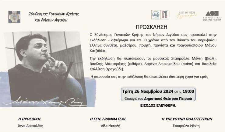 Εκδηλώσεις Εφημερίδα Πολιτισμός Αφιέρωμα στον Μάνο Χατζιδάκι από τον Σύνδεσμο Γυανικών Κρήτης & Νήσων Αιγαίου 21 Νοεμβρίου, 2024 DIMITRIS 0 Σχόλια ΕΚΔΗΛΩΣΕΙΣ, ΠΟΛΙΤΙΣΜΟΣ, ΣΥΝΔΕΣΜΟΣ ΓΥΝΑΙΚΩΝ ΚΡΗΤΗΣ Author: DIMITRIS