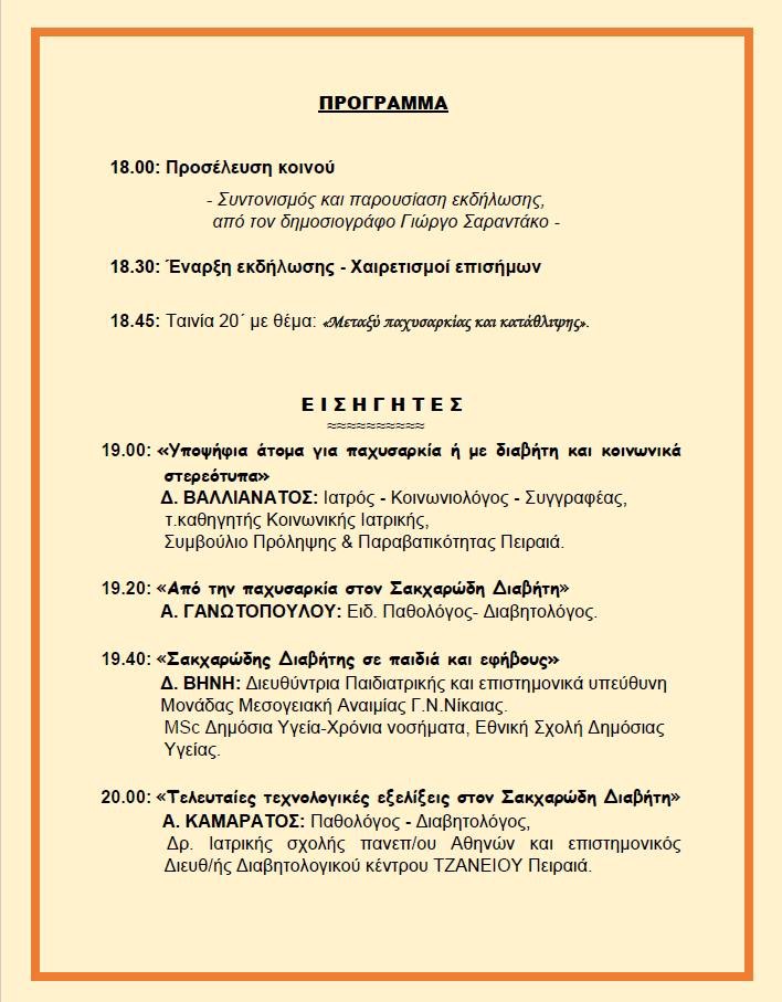Την Τετάρτη 27 Νοεμβρίου στον Πειραϊκό Σύνδεσμο θα πραγματοποιηθεί ομιλία με θέμα “Υποψήφιοι για Παχυσαρκία και Σακχαρώδη Διαβήτη”, για τη σύνδεση μεταξύ παχυσαρκίας και διαβήτη, τις επιπτώσεις τους στην υγεία και τα μέτρα πρόληψης. Ειδικοί στον τομέα της υγείας θα συζητήσουν τις σύγχρονες θεραπείες και τη σημασία της σωστής διατροφής και άσκησης.