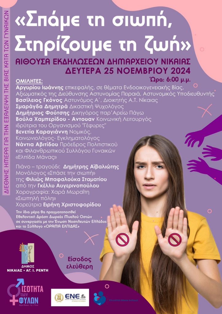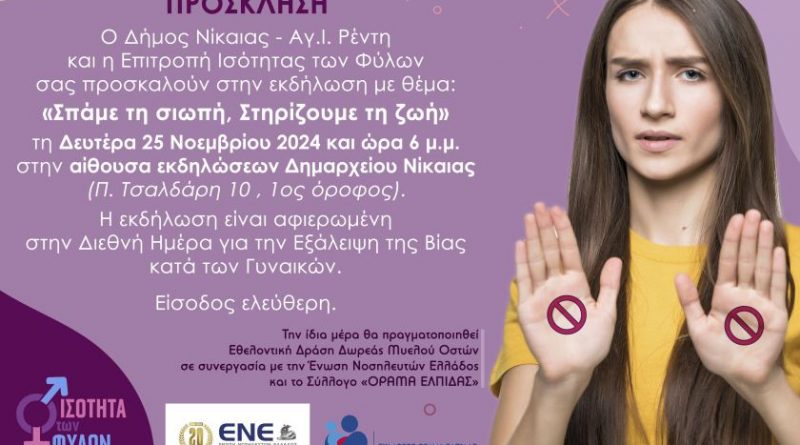 Εκδήλωση με θέμα «Σπάμε τη σιωπή, Στηρίζουμε τη ζωή» διοργανώνει ο Δήμος Νίκαιας-Αγ.Ι. Ρέντη και η Επιτροπή Ισότητας των Φύλων, τη Δευτέρα 25 Νοεμβρίου στις 6.00 μ.μ. στην αίθουσα εκδηλώσεων Δημαρχείου Νίκαιας (Π. Τσαλδάρη 10 , 1ος όροφος). Η εκδήλωση είναι αφιερωμένη στη Διεθνή Ημέρα για την Εξάλειψη της Βίας κατά των Γυναικών και παράλληλα θα πραγματοποιηθεί Εθελοντική Δράση Δωρεάς Μυελού Οστών σε συνεργασία με την Ένωση Νοσηλευτών Ελλάδος και το Σύλλογο «ΟΡΑΜΑ ΕΛΠΙΔΑΣ».