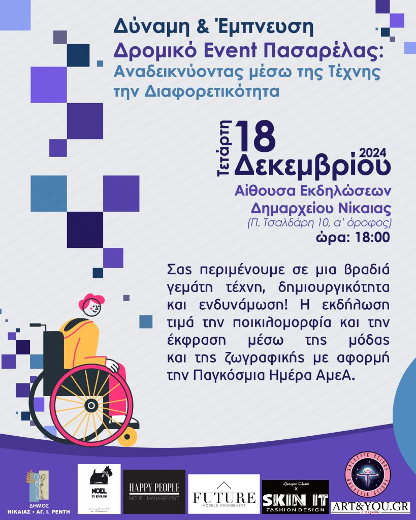 Ένα ξεχωριστό δρομικό event πασαρέλας αφιερωμένο στην Παγκόσμια Ημέρα ΑΜΕΑ που αναδεικνύει τη διαφορετικότητα και την ισότητα μέσω της τέχνης και της μόδας, διοργανώνει ο Δήμος Νίκαιας-Αγ.Ι. Ρέντη , την Τετάρτη 18 Δεκεμβρίου στις 6.00 μ.μ. στο Δημαρχείο Νίκαιας (αίθουσα εκδηλώσεων 1Ος όροφος). Στην πασαρέλα θα πάρουν μέρος επαγγελματίες μοντέλα αλλά και άτομα με αναπηρίες με ρούχα σχεδιαστών μόδας που θα ενσωματώνουν τη φιλοσοφία της ένταξης και της αλληλεγγύης.