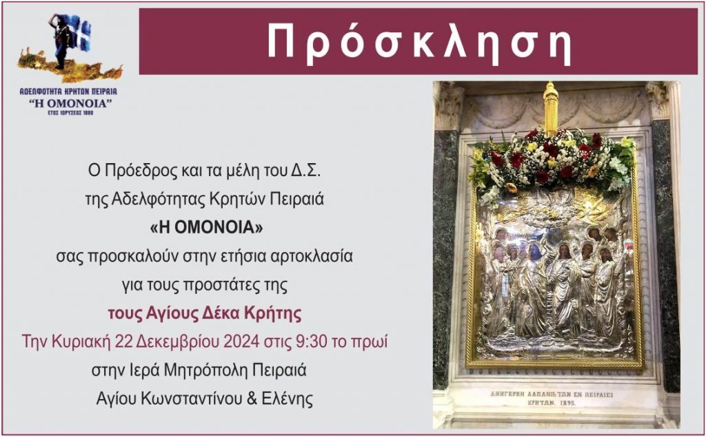 Εκδηλώσεις Εφημερίδα Πειραϊκή Εκκλησία Πολιτισμός Πρόσκληση της Αδελφότητας Κρητών Πειραιά σε αρτοκλασία για τους προστάτες της Άγιους Δέκα Κρήτης 17 Δεκεμβρίου, 202417 Δεκεμβρίου, 2024 DIMITRIS 0 Σχόλια ΑΔΕΛΦΟΤΗΤΑ ΚΡΗΤΩΝ ΠΕΙΡΑΙΑ, ΟΜΟΝΟΙΑ, ΠΕΙΡΑΪΚΗ ΕΚΚΛΗΣΙΑ, ΤΣΟΝΤΟΣ Author: DIMITRIS