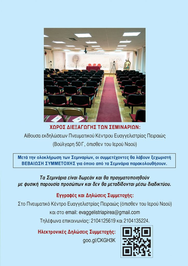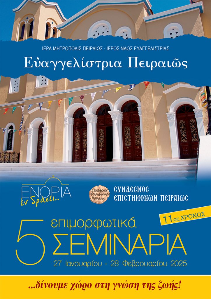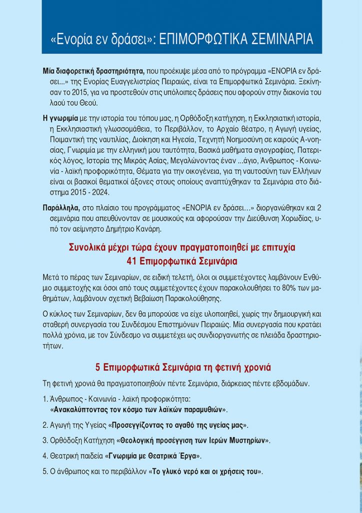 Μία διαφορετική δραστηριότητα, που προέκυψε μέσα από το πρόγραμμα «ΕΝΟΡΙΑ εν δράσει…» της Ενορίας Ευαγγελιστρίας Πειραιώς, είναι τα Επιμορφωτικά Σεμινάρια. Ξεκίνησαν το 2015, για να προστεθούν στις υπόλοιπες δράσεις που αφορούν στην διακονία του λαού του Θεού.