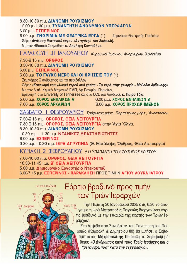 Την Πέμπτη 30 Ιανουαρίου 2025 στις 6.30 το απόγευμα η Ιερά Μητρόπολις Πειραιώς διοργανώνει εόρτιο βραδυνό με την ευκαιρία της εορτής των Τριών Ιεραρχών. Στο Αμφιθέατρο Συνεδρίων του Πανεπιστημίου Πειραιώς (Καραολή & Δημητρίου 80) θα μιλήσει ο Σεβασμιώτατος Μητροπολίτης Πειραιώς κ. Σεραφείμ με θέμα «Ο άνθρωπος κατά τους τρείς Ιεράρχες και ο «μετάνθρωπος» κατά την τεχνολογία και την woke αντζέντα».