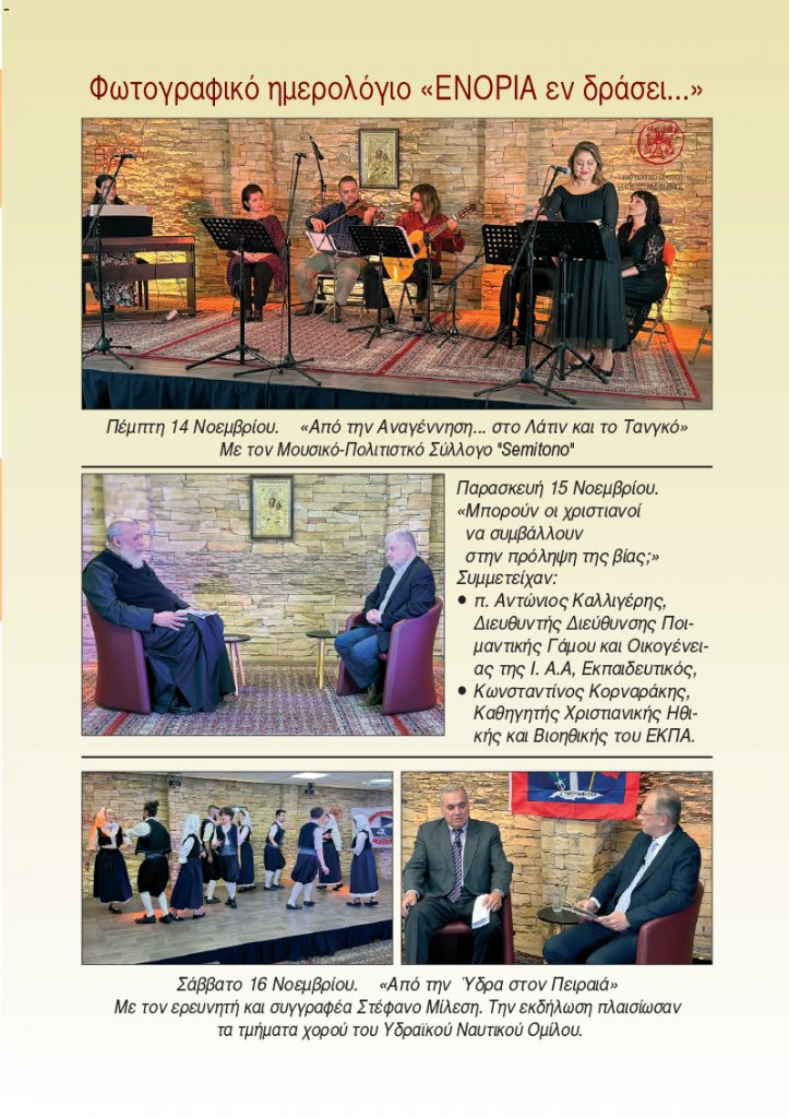 Με την χάρη του Θεού, ολοκληρώθηκε το πρόγραμμα καθημερινών δραστηριοτήτων και εκδηλώσεων του Ιερού Ναού Ευαγγελιστρίας Πειραιώς, με τον εμβληματικό τίτλο «ΕΝΟΡΙΑ εν δράσει», που ξεκίνησε στις 29 Σεπτεμβρίου.