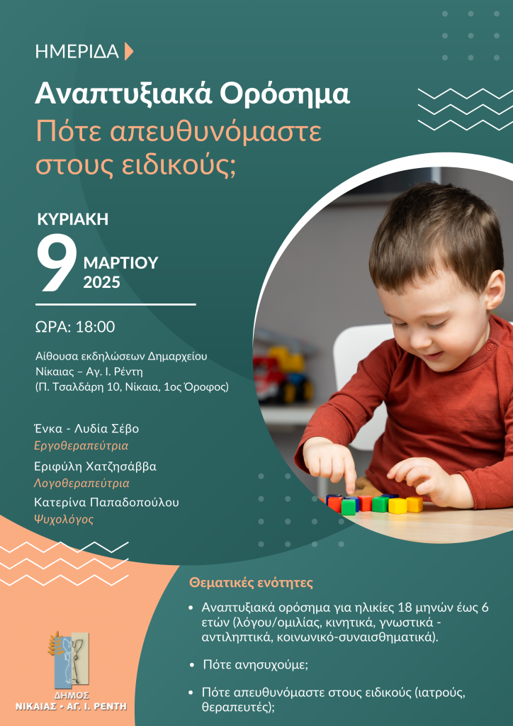 Ημερίδα με θέμα   «Αναπτυξιακά ορόσημα και πότε απευθυνόμαστε στους ειδικούς»,διοργανώνει η Διεύθυνση Προσχολικής Αγωγής του Δήμου Νίκαιας-Αγ.Ι.Ρέντη,  την Κυριακή 9 Μαρτίου  και ώρα 18.00 στην Αίθουσα Εκδηλώσεων Δημαρχείου Νίκαιας (Π. Τσαλδάρη 10, Νίκαια, 1ος Όροφος). Η ημερίδα θα παρουσιαστεί μέσα από την διεπιστημονική προσέγγιση των ειδικοτήτων της Εργοθεραπείας, της Λογοθεραπείας και της Ψυχολογίας.