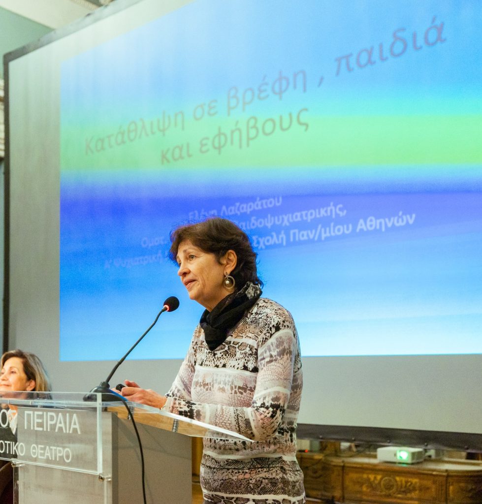 Αντίστοιχα η Ελένη Λαζαράτου, Καθηγήτρια Παιδοψυχιατρικής στο ΕΚΠΑ, μίλησε για τα διαφορετικά είδη της κατάθλιψης που εμφανίζονται σε βρέφη, σε παιδιά σχολικής -ή προσχολικής ηλικίας- και στους έφηβους. Σύμφωνα με την κ. Λαζαράτου, αν και η ψυχική αυτή νόσος προκαλείται και εμφανίζεται σε κάθε άτομο και ηλικιακή ομάδα, από διαφορετικούς παράγοντες, θεραπεύεται πλήρως, ενώ σε κάποιες μορφές της δεν είναι απαραίτητη η χρήση φαρμακευτικών σκευασμάτων. Η ίδια επεσήμανε ότι στα παιδιά και τους εφήβους, που πάσχουν από ψυχικές διαταραχές, τον κυριότερο ρόλο στη θεραπεία τους διαδραματίζουν οι γονείς τους και το οικογενειακό τους περιβάλλον.
