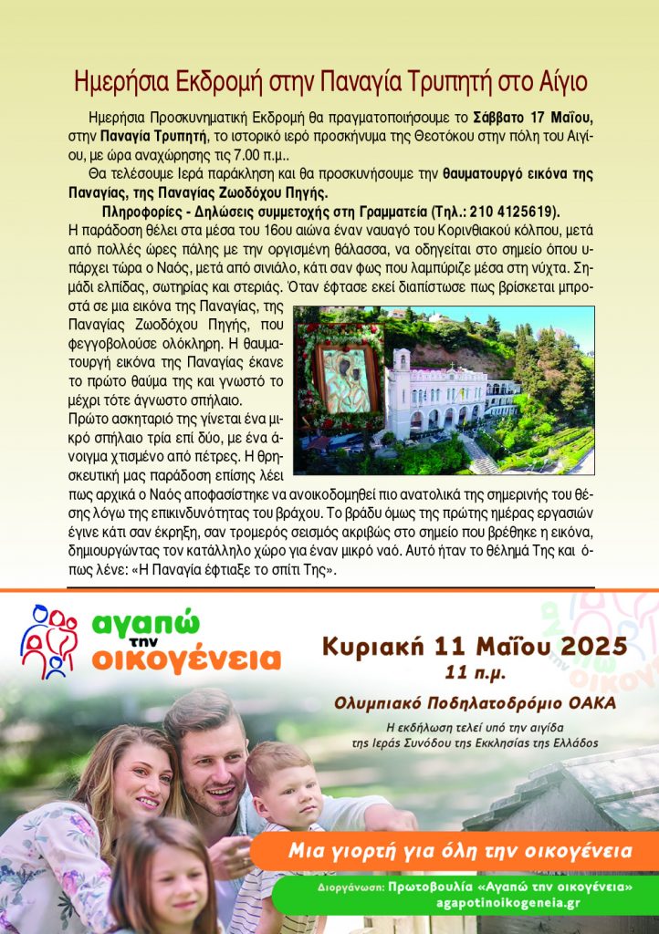 Ημερήσια Εκδρομή στην Παναγία Τρυπητή στο Αίγιο, 17 Μαΐου 2025