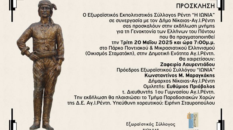 Στο Πάρκο Ποντιακού & Μικρασιατικού Ελληνισμού (Οικισμός Σταματάκη), στη Δημοτική Ενότητα Αγ. Ι. Ρέντη, ο Δήμος σε συνεργασία με τον Σύλλογο «Η ΙΩΝΙΑ», την Τρίτη 20 Μαΐου και ώρα 7:00 μ.μ., τιμούν τα θύματα της Γενοκτονίας, με ομιλητή τον εκπαιδευτικό Ευθύμιο Πριόβολο και με τη συμμετοχή του Τμήματος Παραδοσιακών Χορών της Δ.Ε. Αγ. Ι. Ρέντη. Χαιρετισμούς θα απευθύνουν ο Δήμαρχος Νίκαιας-Αγ.Ι. Ρέντη Κωνσταντίνος Μαραγκάκης και η Ζαφειρία Λαυρεντιάδου, Πρόεδρος Εξωραϊστικού Συλλόγου «Η ΙΩΝΙΑ».