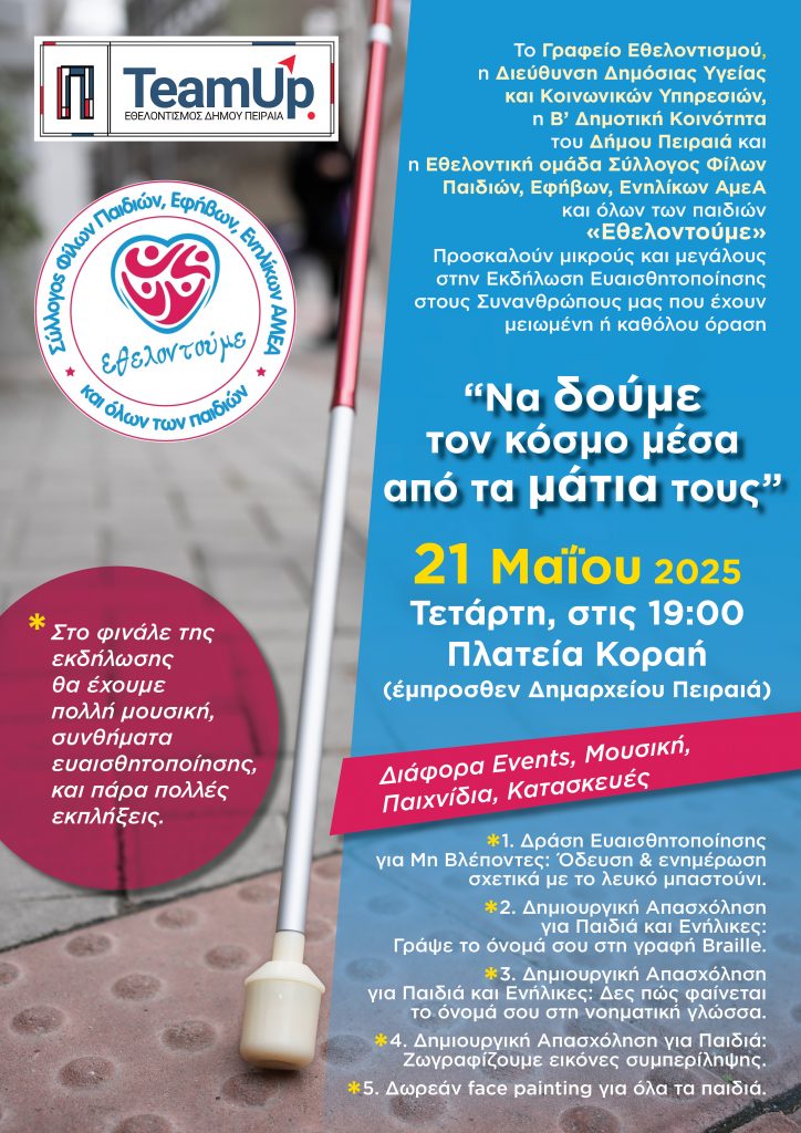 Το Γραφείο Εθελοντισμού, η Διεύθυνση Δημόσιας Υγείας και Κοινωνικών Υπηρεσιών, η Β’ Δημοτική Κοινότητα Δήμου Πειραιά και ο Σύλλογος Φίλων Παιδιών, Εφήβων, Ενηλίκων ΑμεΑ και όλων των παιδιών “Εθελοντούμε” διοργανώνουν μια μεγάλη ημερίδα ευαισθητοποίησης και συμπερίληψης με σύνθημα