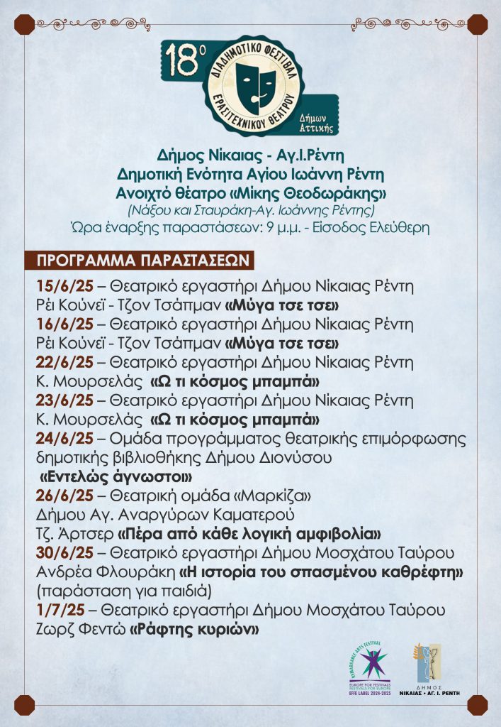 Το Ανοιχτό Θέατρο «Μίκης Θεοδωράκης» (Νάξου και Σταυράκη) στην καρδιά του Αγ. Ι. Ρέντη, φιλοξενεί το 18ο Διαδημοτικό Φεστιβάλ Ερασιτεχνικού Θεάτρου Δήμων Αττικής. Από τις 15 Ιουνίου έως και την 1η Ιουλίου, θεατρικές ομάδες από διάφορους δήμους της Αττικής δίνουν ραντεβού με το κοινό, προσφέροντας παραστάσεις υψηλής αισθητικής με ελεύθερη είσοδο. Η θεατρική αυτή συνάντηση αναδεικνύει το ταλέντο, τη δημιουργικότητα και τη δύναμη της ερασιτεχνικής τέχνης που ενώνει δήμους, φορείς και πολίτες. Το Θεατρικό Εργαστήρι Δήμου Νίκαιας-Αγ.Ι. Ρέντη «ΡΕΝΔΙΑ ΛΕΞΙΣ» συμμετέχει στο φεστιβάλ με δυο έργα : «Μύγα τσε-τσε» των Ρέι Κούνεϊ- Τζον Τσάπμαν, «Ω, τι κόσμος μπαμπά» του Κ. Μουρσελά.