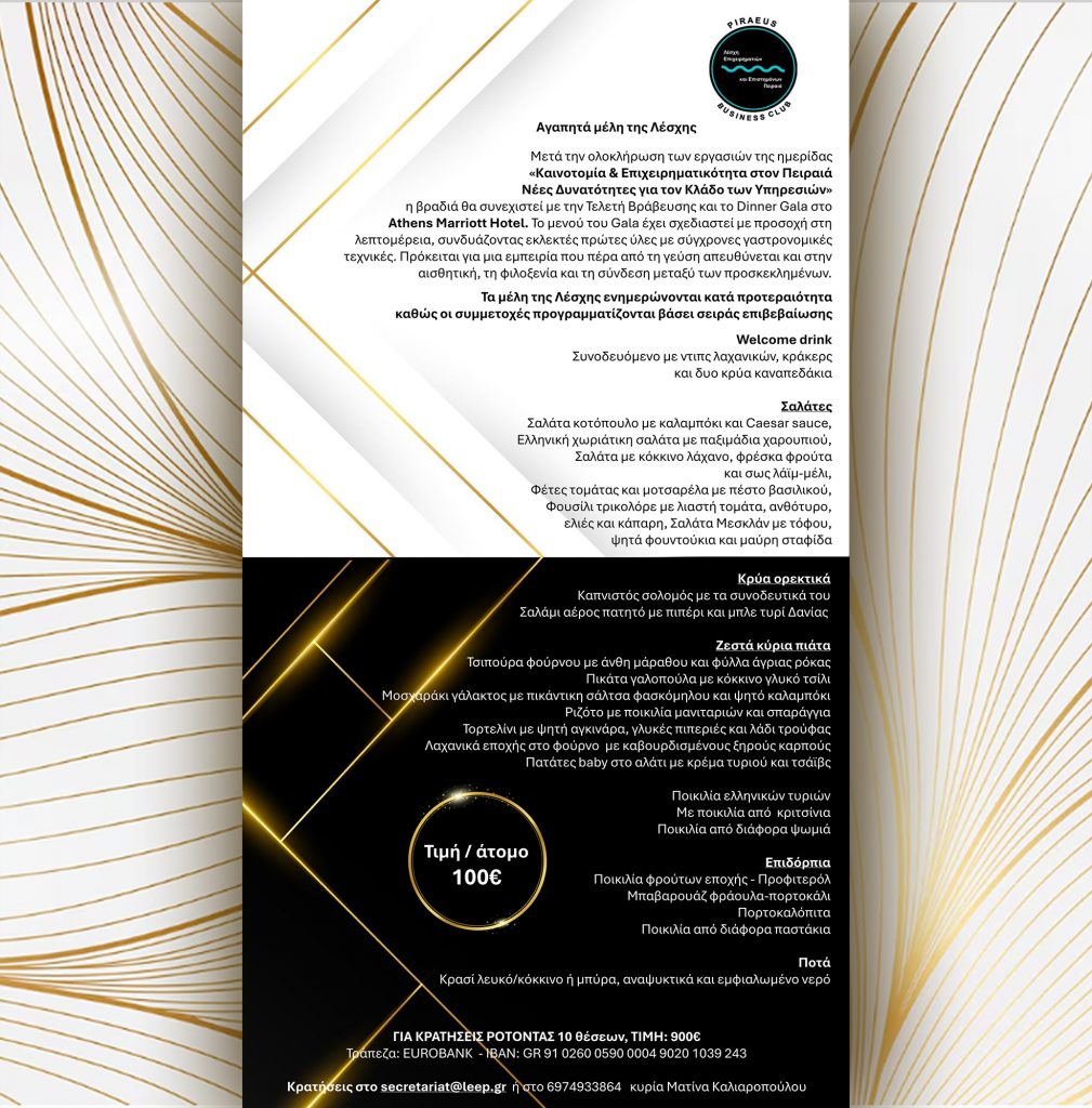 Η Λέσχη Επαγγελματιών & Επιστημόνων Πειραιά σας προσκαλεί στην ημερίδα: «Καινοτομία & Επιχειρηματικότητα στον Πειραιά – Νέες Δυνατότητες για τον Κλάδο των Υπηρεσιών»