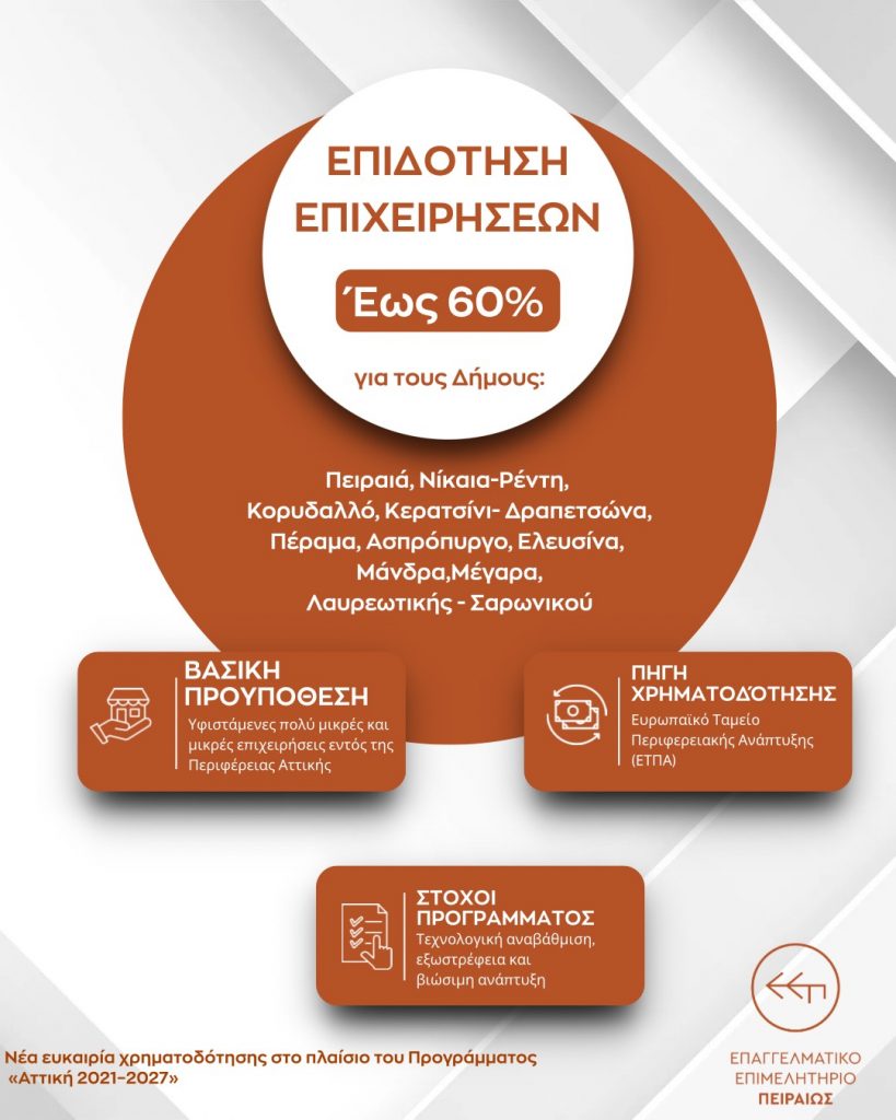 Το Επαγγελματικό Επιμελητήριο Πειραιά ενημερώνει τα μέλη του για τη νέα ευκαιρία χρηματοδότησης στο πλαίσιο του Προγράμματος «Αττική 2021–2027».