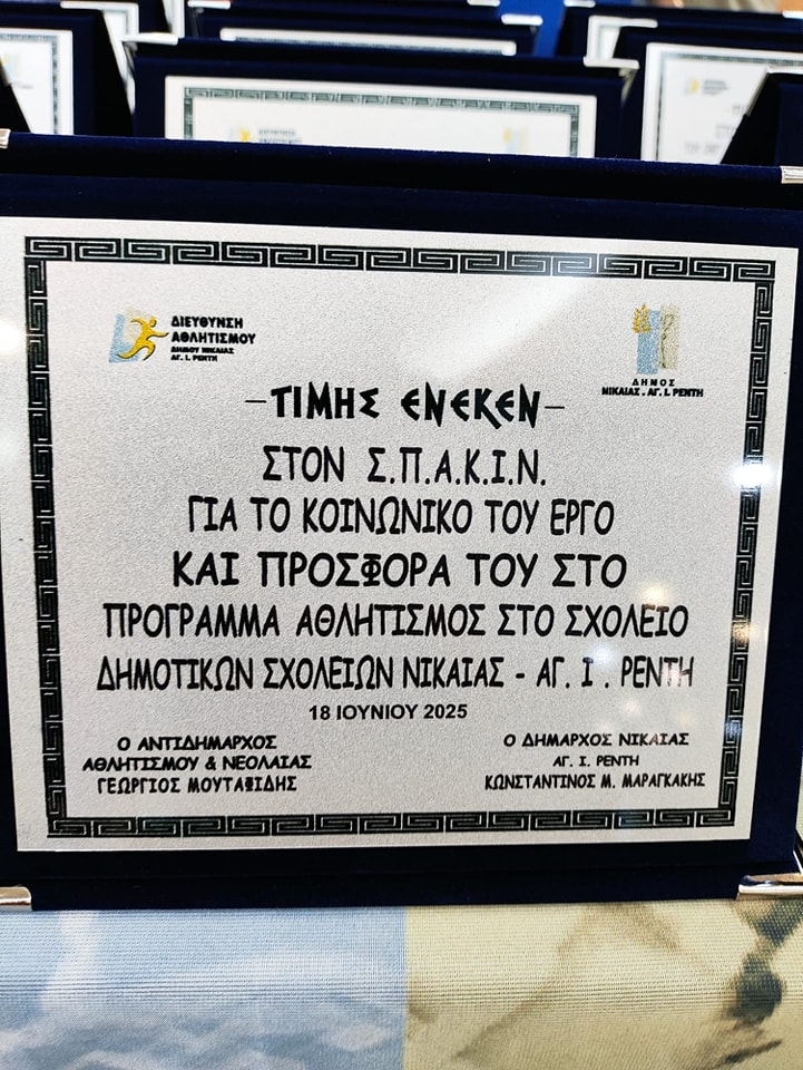 Ο Δήμος Νίκαιας-Αγ.Ι. Ρέντη τίμησε τον Σ.Π.Α.Κ.Ι.Ν. & την ‘Ενωση Συλλόγων Γονέων Νίκαιας- Αγ.Ι. Ρέντη για την προσφορά τους στον σχολικό αθλητισμό