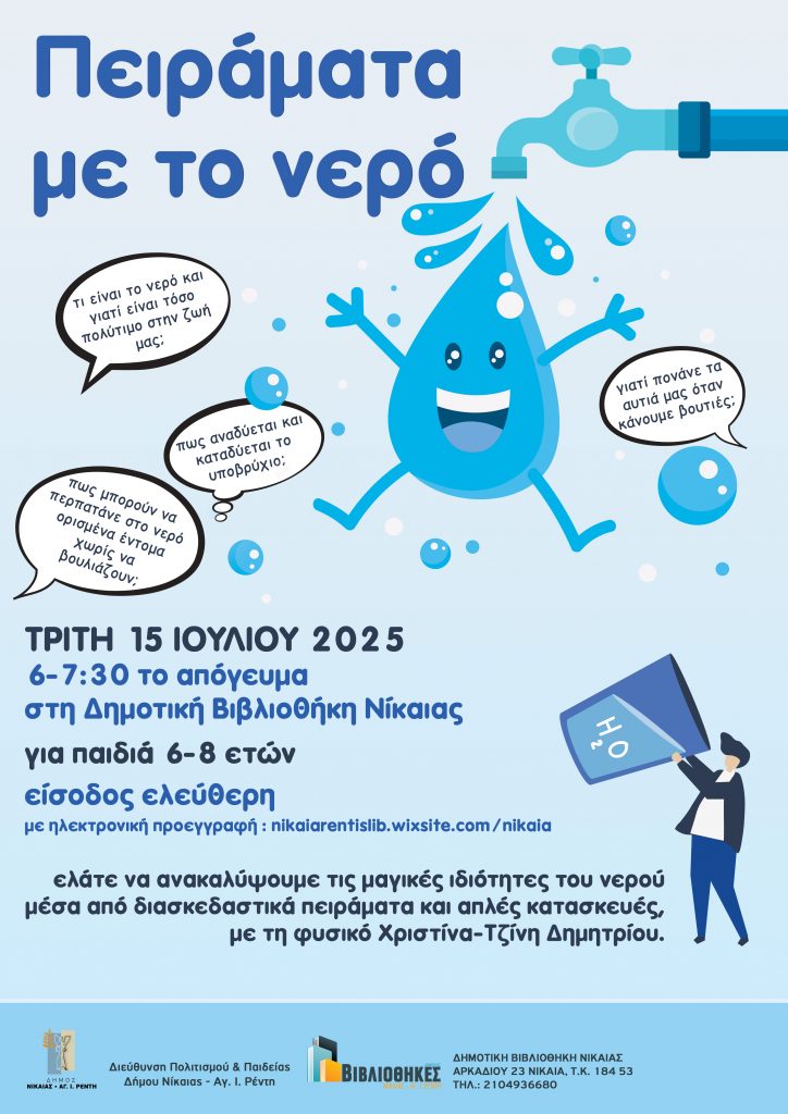 Η Δημοτική Βιβλιοθήκη Νίκαιας  διοργανώνει δράση με θέμα «Πειράματα με το νερό» και προσκαλεί τους μικρούς της φίλους να γνωρίσουν με βιωματικό και διασκεδαστικό τρόπο τις μαγικές του ιδιότητες ! Την Τρίτη 15 Ιουλίου, από τις 6:00 μ.μ έως τις 7:30 μ.μ., στον χώρο της βιβλιοθήκης (Αρκαδίου 23), παιδιά ηλικίας 6-8 ετών θα συμμετάσχουν σε πειράματα και κατασκευές που θα τους αποκαλύψουν τα μυστικά του νερού και τη σημασία του στη ζωή μας.
