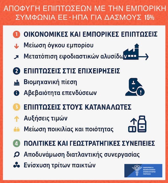 Το Εμπορικό και Βιομηχανικό Επιμελητήριο Πειραιώς ταυτίζεται με όσους πιστεύουν πως η επιτευχθείσα συμφωνία μεταξύ Ευρωπαϊκής Ένωσης και ΗΠΑ αποσόβησε τα χειρότερα, σε μία χρονική συγκυρία όπου οι γεωπολιτικές αναταράξεις απειλούν την ευρωπαϊκή οικονομία, και όχι μόνο. Η συμφωνία αυτή, που συνομολογήθηκε μετά από μακρές διαπραγματεύσεις, έθεσε ένα νέο πλαίσιο συνεργασίας βασισμένο στη σταθερότητα και την αμοιβαία εμπιστοσύνη, ενώ σηματοδοτεί ένα σημαντικό βήμα για την αποφυγή ενός επικείμενου εμπορικού πολέμου εκ μέρους των ΗΠΑ, διατηρώντας παράλληλα τις ευρωπαϊκές εξαγωγές και θέσεις εργασίας σε σταθερή τροχιά. Παράλληλα, ΕΕ και ΗΠΑ συνεχίζουν να είναι οι πιο στενοί εταίροι, έτοιμοι να συνεργαστούν ενάντια σε χώρες που δεν τηρούν τους κανόνες της αγοράς και των περιβαλλοντικών προτύπων υποστηρίζοντας το κοινό όραμα δημοκρατιών που αντιμετωπίζουν τα παγκόσμια προβλήματα με βιώσιμες λύσεις. Η Ε.Ε. διατηρεί «ανοικτή την πόρτα» στις αγορές για τις ευρωπαϊκές επιχειρήσεις, αλλά και των εξαγωγών ευρωπαϊκών προϊόντων στις αμερικανικές αγορές γεγονός ιδιαίτερα σημαντικό και για τις ελληνικές επιχειρήσεις που εξάγουν στις ΗΠΑ.