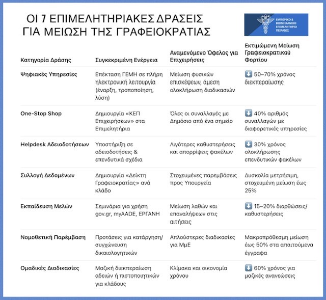 Τέλος, οι ψηφιακοί «οδηγοί επιβίωσης» για νέες επιχειρήσεις, με έτοιμα «checklists» και πρότυπα εγγράφων, καθώς και τα «manual οδηγιών» για εξαγωγικές δραστηριότητες όπως εφοδιασμοί πλοίων και ναυπηγείων είναι παραδείγματα καλής πρακτικής. Η καθιέρωση webinars με τα υπουργεία ώστε οι επιχειρήσεις-μέλη θα μαθαίνουν τις αλλαγές απευθείας από την πηγή, πρέπει να εφαρμοστεί από όλα τα Επιμελητήρια. Το Ε.Β.Ε.Π. θα συνεχίσει να βελτιώνεται, ενώ έχει ήδη υιοθετήσει ένα σύγχρονο μοντέλο με πλήρως ψηφιοποιημένο Γ.Ε.ΜΗ., με εκπαιδευτικά προγράμματα για μείωση διοικητικών λαθών και με συνεχή συνεργασία με όλα αρμόδια Υπουργεία και ιδιαιτέρως με το Ανάπτυξης για την απλοποίηση των αδειοδοτήσεων λειτουργίας επιχειρηματικών πάρκων. Στη «μάχη» κατά  της γραφειοκρατίας, δεν περισσεύει κανείς και το Ε.Β.Ε.Π. καλωσορίζει τις δώδεκα άμεσα υλοποιήσιμες παρεμβάσεις της κυβέρνησης με στόχο τη μείωση του διοικητικού βάρους για τις επιχειρήσεις.