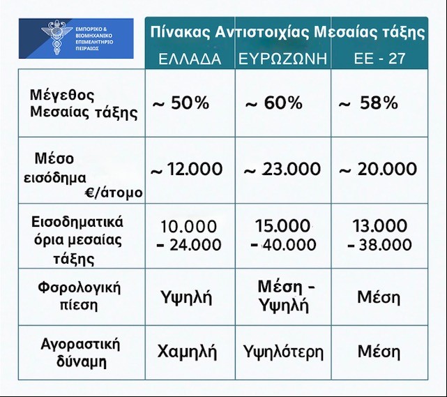 Το Εμπορικό και Βιομηχανικό Επιμελητήριο Πειραιώς επιχειρεί να απαντήσει με πίνακες και διαγράμματα στην ερώτηση, ποια είναι τελικά η μεσαία τάξη στη χώρα μας σήμερα. Επίσης, μια άλλη ερώτηση που χρήζει απάντησης είναι γιατί στην Ελλάδα ο όρος «μεσαία τάξη» χρησιμοποιείται συχνά στη δημόσια συζήτηση, αλλά δεν έχει έναν απολύτως ξεκάθαρο και ομοιόμορφο ορισμό. Στην πράξη, βεβαίως, μπορούμε να τη δούμε από τρεις οπτικές, τη στατιστική, κοινωνιολογική και οικονομική. Ξεκινώντας από τον οικονομικό ορισμό ημεσαία τάξη συνδέεται, κυρίως, με το εισόδημα σε σχέση με τον μέσο ατομικό μισθό, ή το συνολικό οικογενειακό εισόδημα. Σύμφωνα με τον ΟΟΣΑ και την Eurostat, η μεσαία τάξη δεν έχει το ίδιο μέγεθος και δύναμη σε όλες τις χώρες και γι’ αυτό σε ευρεία κλίμακα θεωρούνται τα νοικοκυριά που έχουν ισοδύναμο διαθέσιμο εισόδημα μεταξύ 75% και 200% του μέσου εισοδήματος της χώρας.