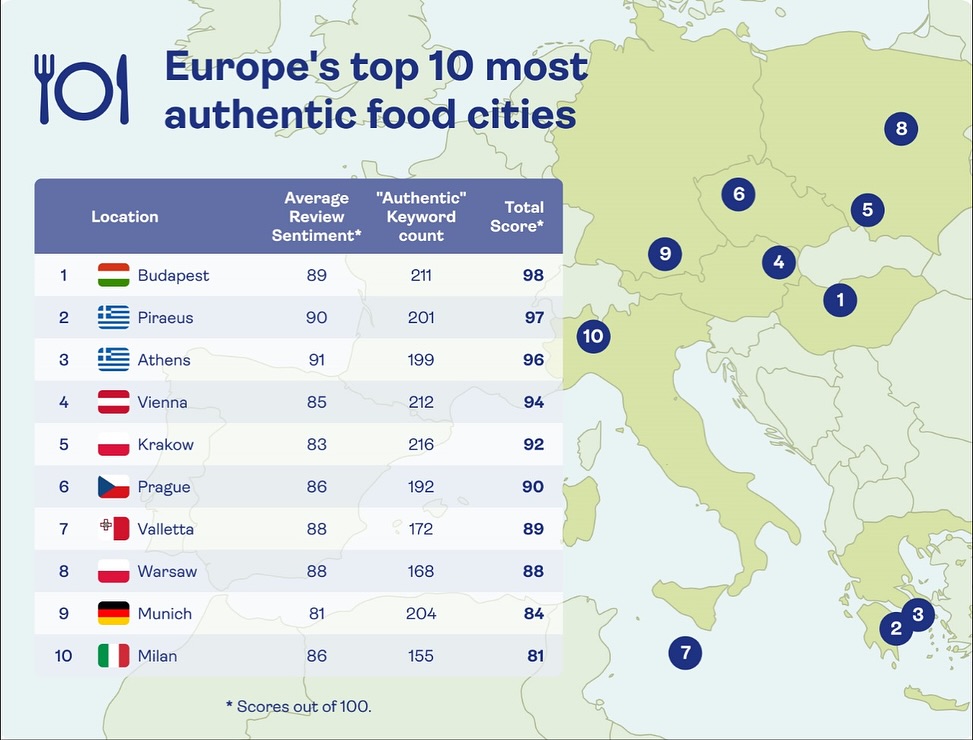 Η έρευνα εξέτασε περισσότερα από 5.000 εστιατόρια σε 125 ευρωπαϊκές πόλεις. Ο Πειραιάς αναδείχθηκε 2ος, με εντυπωσιακή βαθμολογία 97/100, βάσει στοιχείων από κριτικές στη Google. Η αξιολόγησηβασίστηκε στη συχνότητα εμφάνισης των όρων «authentic» και «traditional», καθώς και στη συνολικά θετική εικόνα που αποτυπώνουν οι επισκέπτες στις κριτικές τους. Ιδιαίτερη αναφορά γίνεται στη θαλασσινή κουζίνα του Πειραιά και στη μακραίωνη γαστρονομική του παράδοση, που συνεχίζει να τον κάνει να ξεχωρίζει.