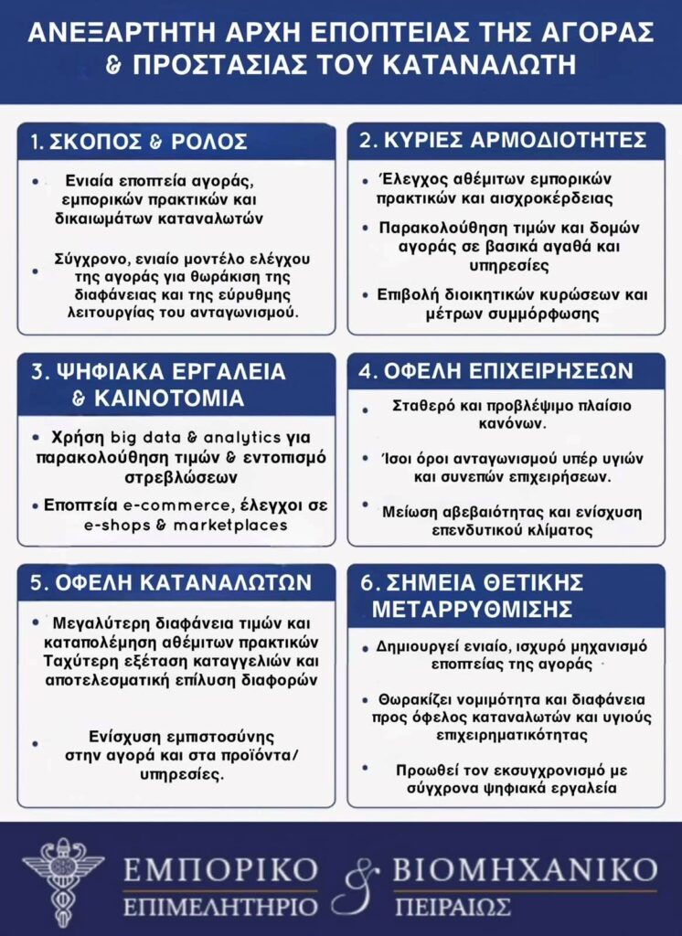 Το Εμπορικό και Βιομηχανικό Επιμελητήριο Πειραιώς (Ε.Β.Ε.Π.) θεωρεί πολύ σημαντική θεσμική τομή το Σχέδιο Νόμου για την ενίσχυση της διαφάνειας, της εύρυθμης λειτουργίας της αγοράς και της προστασίας των καταναλωτών. Η δημιουργία μιας σύγχρονης και λειτουργικά ανεξάρτητης Αρχής ανταποκρίνεται στα ευρωπαϊκά πρότυπα εποπτείας, ενισχύει την εμπιστοσύνη στο οικονομικό περιβάλλον και συμβάλλει στην αποτελεσματικότερη αντιμετώπιση στρεβλώσεων, αθέμιτων πρακτικών και φαινομένων αισχροκέρδειας. Η νέα Αρχή θα λειτουργεί παράλληλα με την Αρχή Ανταγωνισμού, θα πλαισιώνεται από υφιστάμενα στελέχη του Συνηγόρου του Καταναλωτή, της Γενικής Διεύθυνσης Αγοράς, της ΔΙΜΕΑ, η οποία έχει κάνει μια σημαντική δουλειά ως προς τον έλεγχο της αγοράς. Έτσι, μπαίνει ένα τέλος και σε μια πολυδιάσπαση, ενοποιώντας υπηρεσίες που ουσιαστικά έχουν κοινές δράσεις. Ο νέος αυτός θεσμός θα έχει την ευθύνη των ελέγχων, των καταγγελιών, των κυρώσεων, αλλά και της εξωδικαστικής επίλυσης των διαφορών.