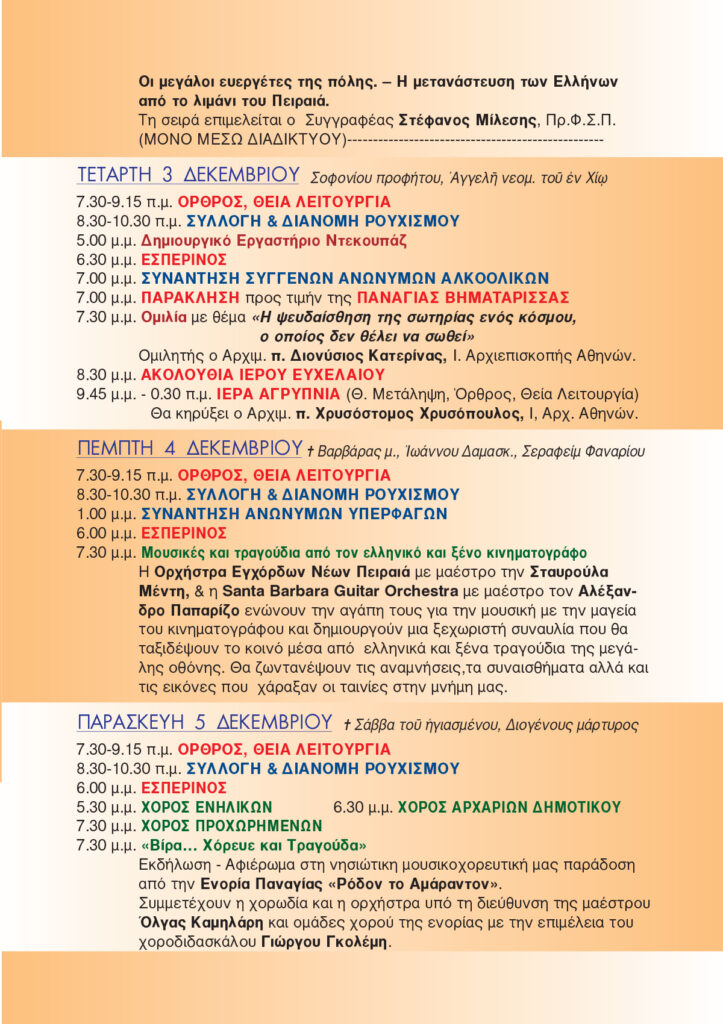 Συμμετέχουν η χορωδία και η ορχήστρα υπό τη διεύθυνση της μαέστρου Όλγας Καμηλάρη και ομάδες χορού της ενορίας με την επιμέλεια του χοροδιδασκάλου Γιώργου Γκολέμη.