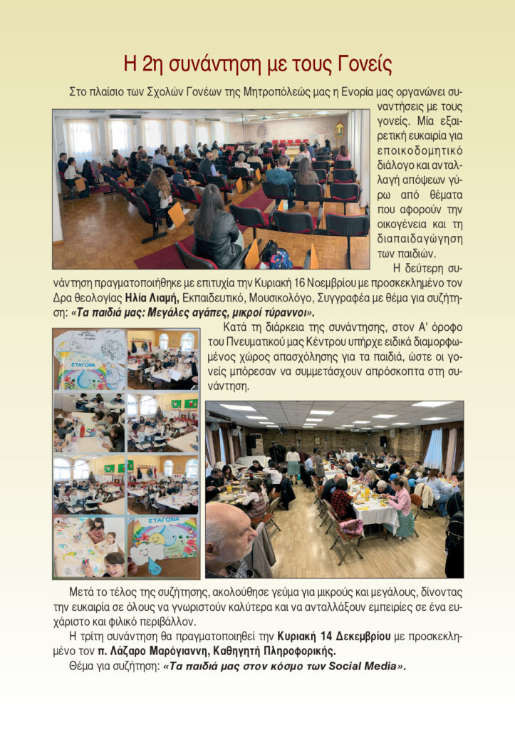 Η Ενορία μας οργανώνει συνάντηση με τους γονείς, την Κυριακή 14 Δεκεμβρίου στις 12 το μεσημέρι με βασικόπροσκεκλημένο τον π. Λάζαρο Μαρόγιαννη, Καθηγητή Πληροφορικής.