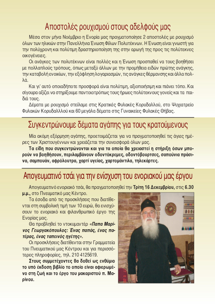 Όποιος θα ήθελε να γίνει Εθελοντής της Αγάπης διεξάγοντας τον Έρανο στην πολυκατοικία όπου διαμένει, να το δηλώσει στη Γραμματεία του Πνευματικού μας Κέντρου (τηλ.: 2104125619).