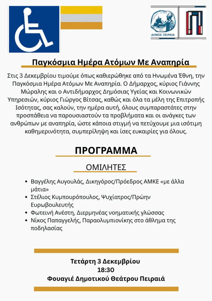 Εκδηλώσεις Εφημερίδα Τα νέα του Δήμου Υγεία Ο Δήμος Πειραιά και η Δ/νση Δημόσιας Υγείας & Κοινωνικών Υπηρεσιών τιμούν την Παγκόσμια Ημέρα Ατόμων με Αναπηριά 30 Νοεμβρίου, 202530 Νοεμβρίου, 2025 DIMITRIS 0 Σχόλια ΒΙΤΣΑΣ, ΔΗΜΟΣ ΠΕΙΡΑΙΑ, ΕΚΔΗΛΩΣΕΙΣ, ΜΩΡΑΛΗΣ, ΠΟΛΙΤΙΣΜΟΣ, ΥΓΕΙΑ Author: DIMITRIS