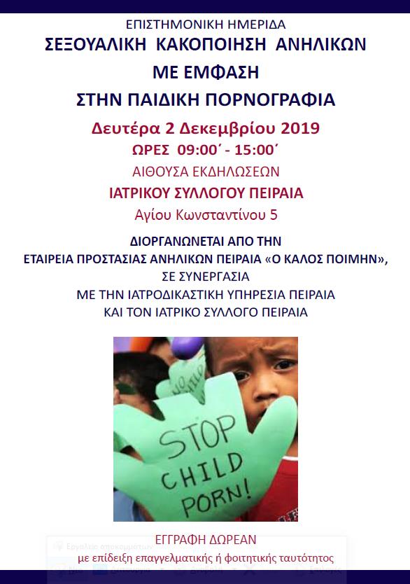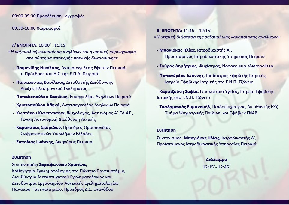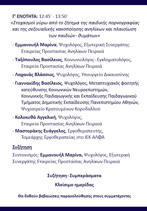Σας προσκαλούμε στην ημερίδα της Εταιρείας Προστασίας Ανηλίκων με θέμα “Σεξουαλική κακοποίηση ανηλίκων με έμφαση στην παιδική πορνογραφία”.