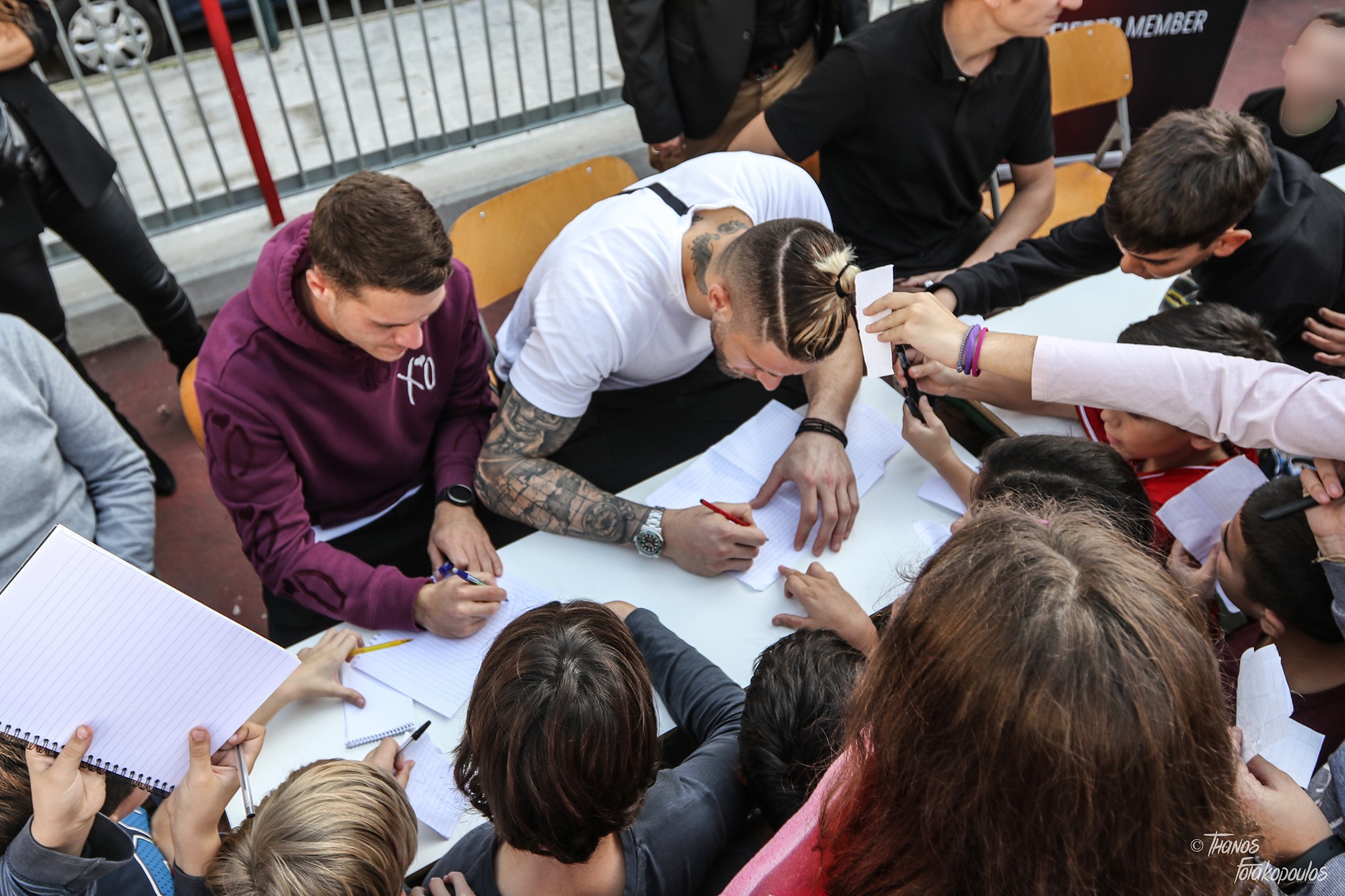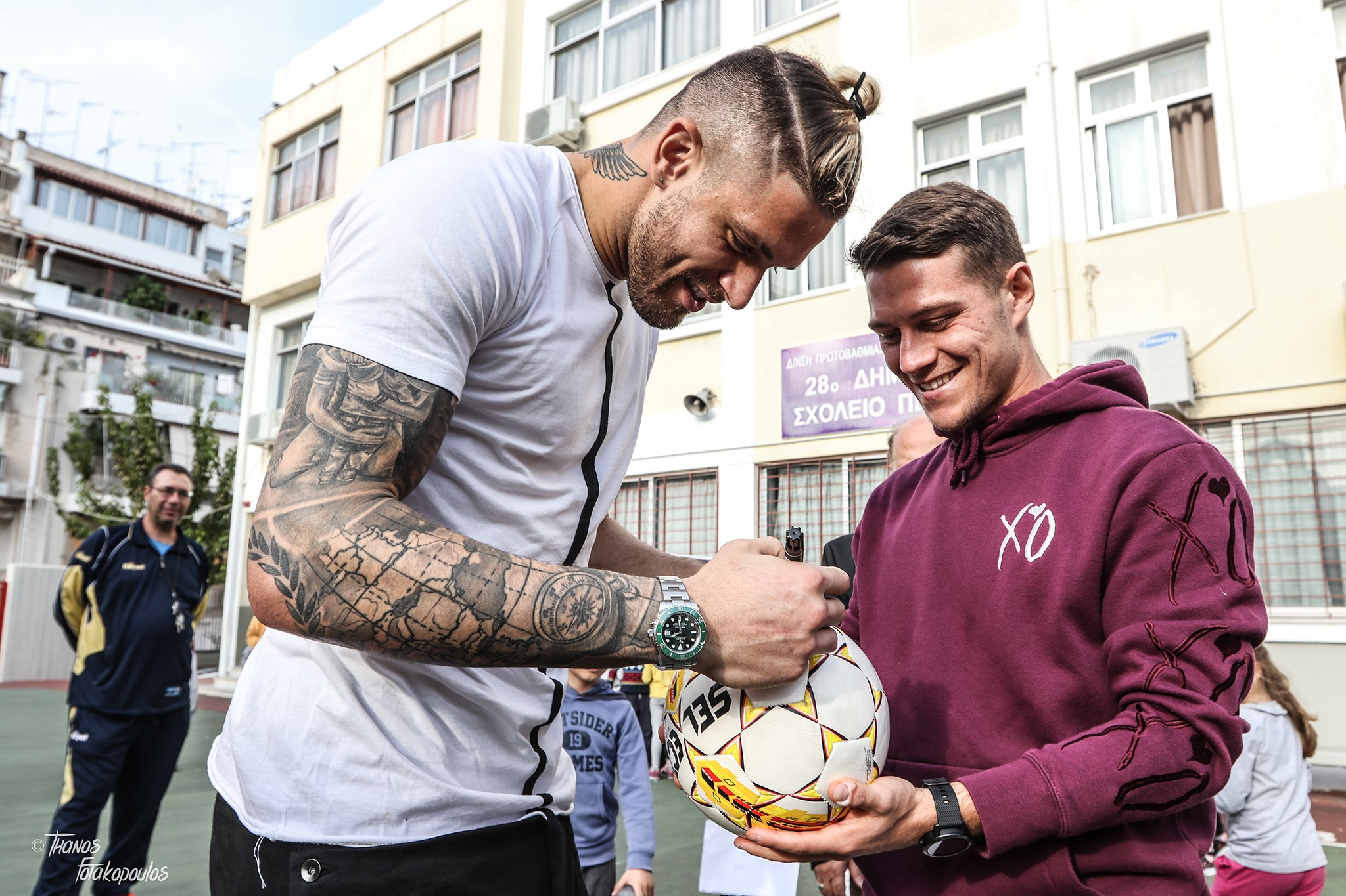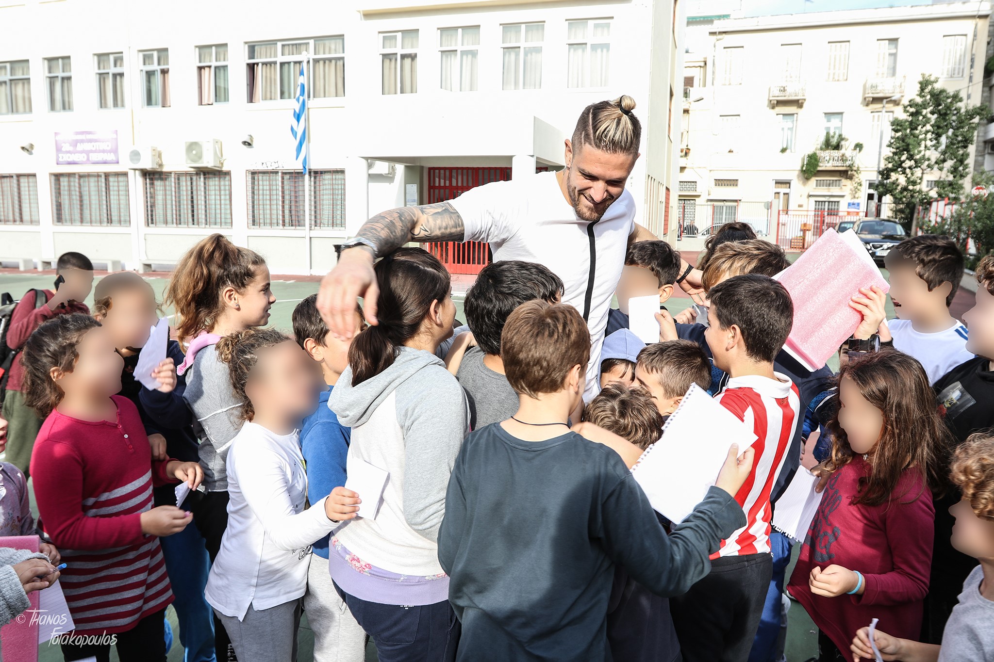 “δεν υφίστανται διαχωριστικές γραμμές. Οι συνάδελφοί μας Λεονάρντο Κούτρης και Αλέξανδρος Πασχαλάκης επισκέφθηκαν το 28ο Δημοτικό Σχολείο Πειραιά και μοιράστηκαν με τα παιδιά το νόημα του αθλητισμού. Αντίπαλοι είμαστε μόνο για όσο διαρκεί ένας αγώνας. Στη ζωή πορευόμαστε μαζί, πλάι πλάι, συμπαίκτες!”
