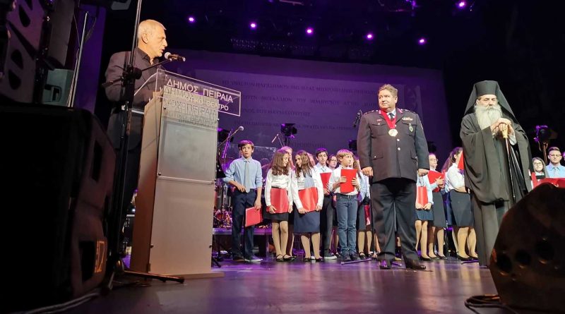 O κ. Μώραλης απένειμε μαζί με τον Σεβασμιώτατο Μητροπολίτη Πειραιώς και Φαλήρου κ.κ. Σεραφείμ «το χρυσό μετάλλιο του πολιούχου Αγίου Σπυρίδωνος του θαυματουργού» στον Αρχηγό της ΕΛΑΣ, Αντιστράτηγο κ. Μιχαήλ Καραμαλάκη.