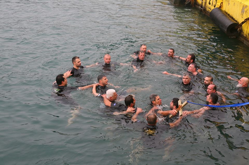 Τον σταυρό ανέσυραν από τα νερά του λιμανιού του Πειραιά άνδρες του Συνδέσμου Ελλήνων Βατραχανθρώπων.