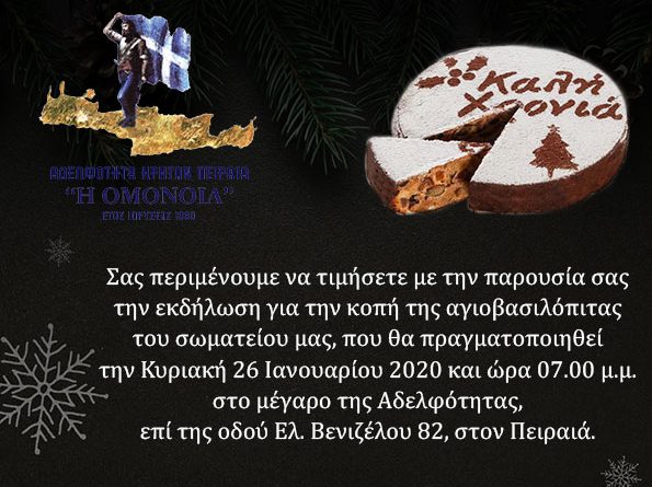Ο Πρόεδρος και τα μέλη του Δ.Σ. της Αδελφότητας Κρητών Πειραιά «Η ΟΜΟΝΟΙΑ», σας προσκαλούν, στην ετήσια εκδήλωση για την κοπή της αγιοβασιλόπιτας του σωματείου τους που θα πραγματοποιηθεί, την Κυριακή 26 Ιανουαρίου 2020 και ώρα 07.00 μ.μ. στο μέγαρο της Αδελφότητας, επί της οδού Ελ. Βενιζέλου 82, στον Πειραιά.