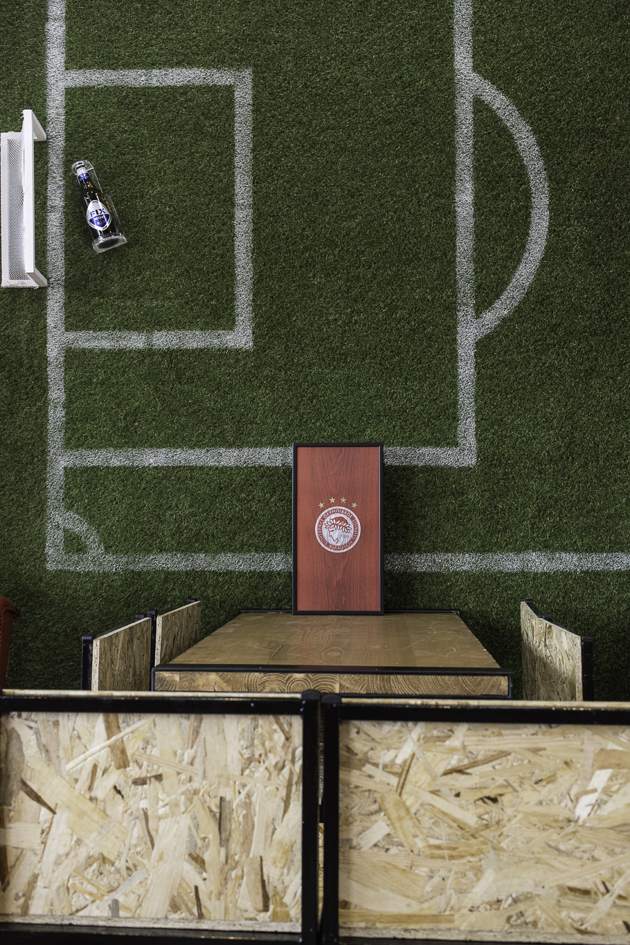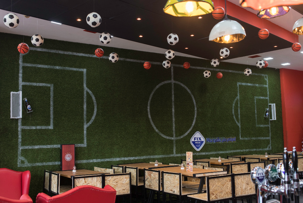 Όλος ο χώρος με κόκκινες πινελιές και πολλές οθόνες όπου συνιστούν ένα καλόγουστο ντεκόρ. Ο συμβολισμός του κόκκινου χρώματος κρύβει έννοιες όπως ενέργεια, δύναμη, εξουσία, πάθος, στην ατζέντα πάλι των Ελλήνων ποδοσφαιρόφιλων η σημασία του είναι μία και απολύτως αυτονόητη.