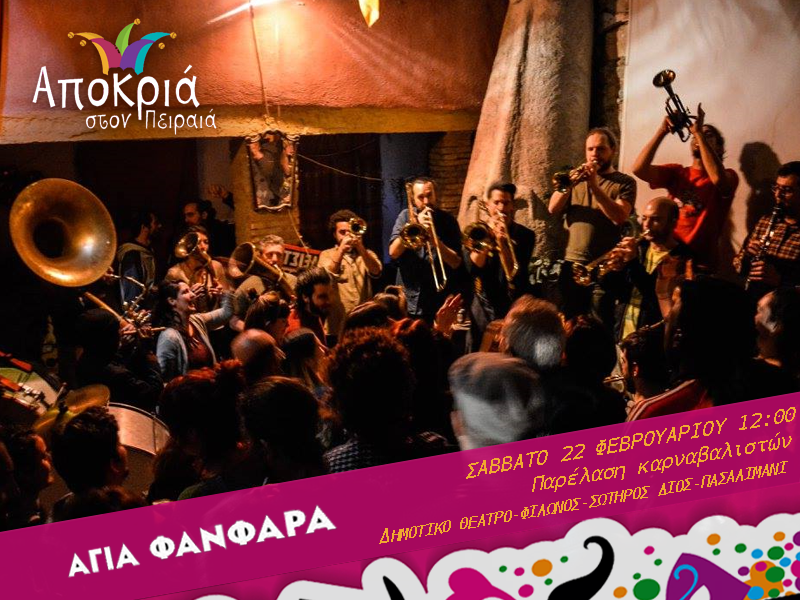 Η μπάντα χάλκινων οργάνων «Αγία Φανφάρα» δίνει τον παλμό της Αποκριάς στους δρόμους της πόλης με μια ξεχωριστή μουσική αποκριάτικη διαδρομή, καταλήγοντας όλοι μαζί στο Πασαλιμάνι όπου θα συνεχιστεί η διασκέδαση με πανηγυρική διάθεση και τρελό κέφι.
