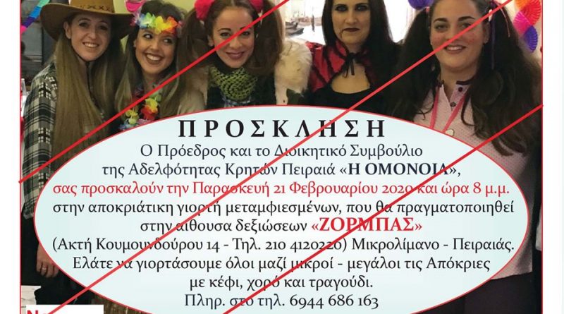 Ο Πρόεδρος και το Διοικητικό Συμβούλιο της Αδελφότητας Κρητών Πειραιά «Η ΟΜΟΝΟΙΑ» σας προσκαλούν την Παρασκευή 21 Φεβρουαρίου 2020 και ώρα 8 μ.μ. στην αποκριάτικη γιορτή μεταμφιεσμένων, που θα πραγματοποιηθεί στην αίθουσα δεξιώσεων «ΖΟΡΜΠΑΣ» (Ακτή Κουμουνδούρου 14 – Τηλ. 210 4120220) Μικρολίμανο – Πειραιάς.