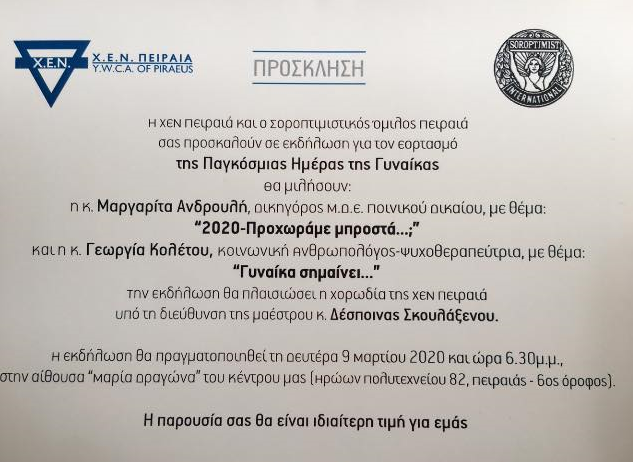 Η ΧΕΝ Πειραιά και ο Σοροπτιμιστικός Όμιλος Πειραιά σας προσκαλούν σε εκδήλωση για τον εορτασμό της Παγκόσμιας Ημέρας της Γυναίκας.