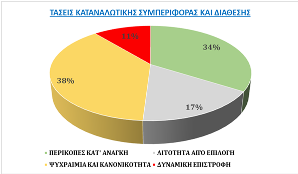 Σύμφωνα με την έρευνα, η πανδημία του κορονοϊού ανέδειξε 4 νέες τάσεις στη καταναλωτική συμπεριφορά και διάθεση των κατοίκων στη Περιφέρεια Αττικής. Οι κατηγορίες περιγράφουν τις καταναλωτικές τάσεις για συνέχιση περικοπών, και λιτότητας, καθώς και επιστροφή στη κανονικότητα και την πρότερη δυναμικότητα. Η πρώτη κατηγορία καταναλωτών είναι αυτή που συνεχίζουν τις περικοπές (34%). Περισσότεροι από 3 στους 10 έχουν περιορίσει τις δαπάνες τους εξ ανάγκης σε όλες τις κατηγορίες αγορών, υπό το βάρος των επιπτώσεων της πανδημίας στην απασχόληση τους. Η επόμενη κατηγορία καταναλωτών, ξοδεύει για αγορές λιγότερα, επειδή διακατέχεται από απαισιοδοξία για το μέλλον (17%). Οι 2 στους 10 επιλέγουν να συνεχίσουν τη λιτότητα περισσότερο από φόβο και ανασφάλεια. Τη μεγαλύτερη κατηγορία αποτελούν οι 4 στους 10 που παραμένουν ψύχραιμοι και επιστρέφουν στη κανονικότητα, αλλά ξοδεύοντας προσεκτικά (38%). Στη μικρότερη και τελευταία κατηγορία είναι μόλις 1 στους 10 που καταναλώνει πιο ελεύθερα, αλλά χωρίς να ξοδεύει περισσότερα από πριν (11%).