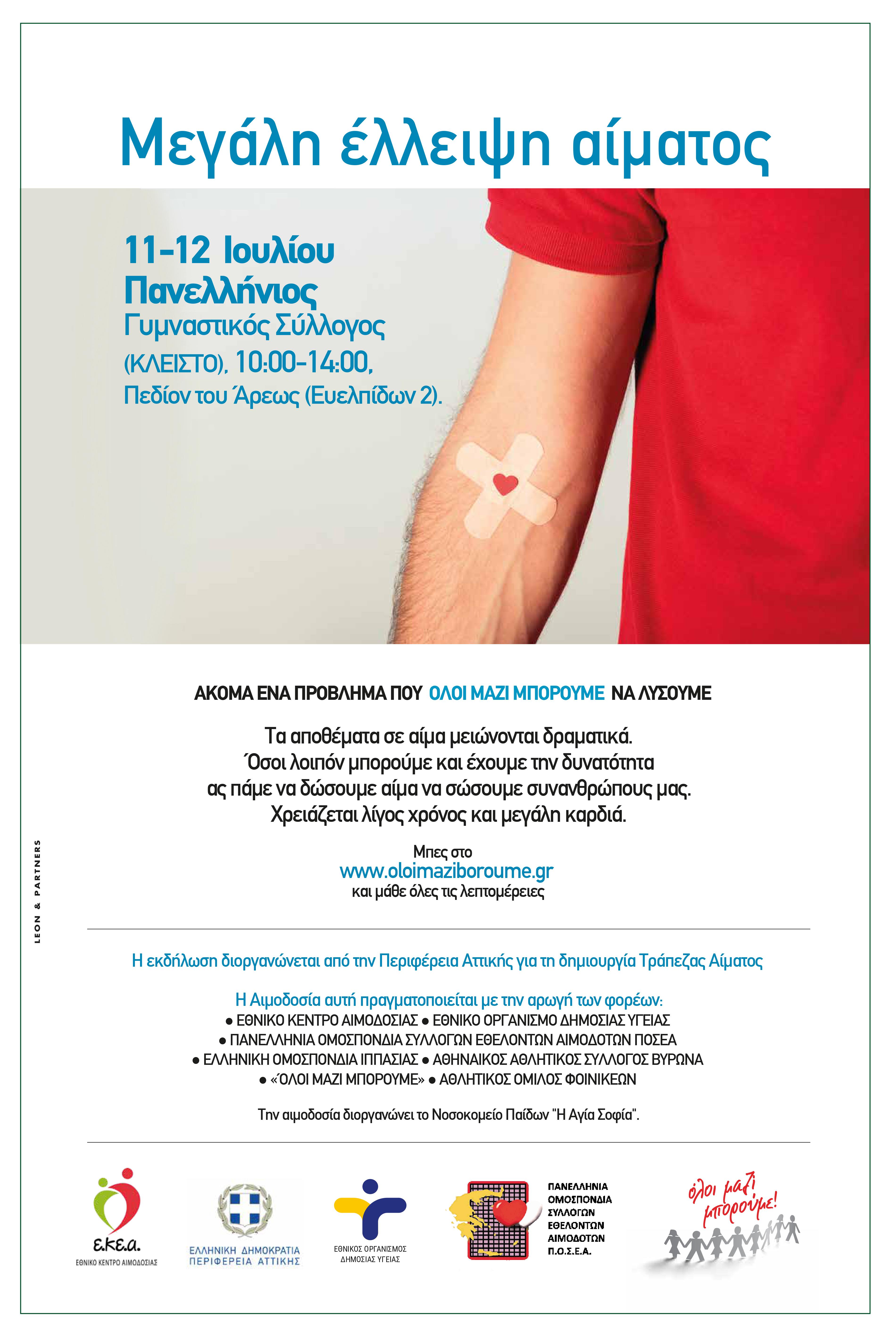 Εθελοντική  αιμοδοσία οργανώνει η Περιφέρεια Αττικής  το διήμερο 11 και 12 Ιουλίου από τις  10:00 το πρωί μέχρι τις 02:00 το μεσημέρι,  στον Πανελλήνιο Γυμναστικό Σύλλογο που βρίσκεται στο Πεδίον του Άρεως (Ευελπίδων 2).