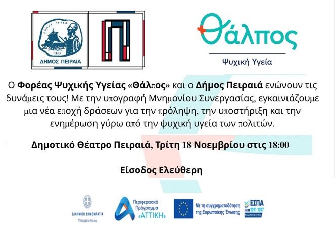 ΠερισσότεραΟ Φορέας Ψυχικής Υγείας «Θάλπος» και ο Δήμος Πειραιά ενώνουν τις δυνάμεις τους για την ψυχική υγεία των πολιτών. Υπογραφή