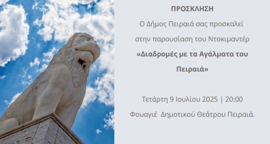 Πρόσκληση στην παρουσίαση του Ντοκιμαντέρ “Διαδρομές με τα Αγάλματα του Πειραιά”, το οποίο δημιουργήθηκε στο πλαίσιο της τουριστικής προβολής του Δήμου