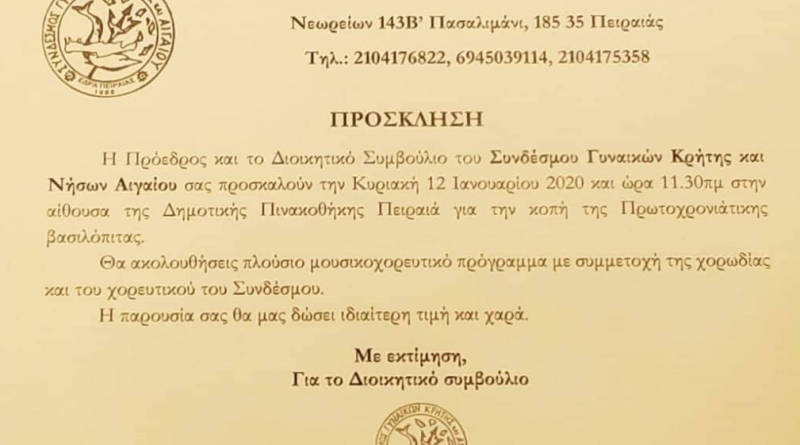 Η Πρόεδρος και το Διοικητικό Συμβούλιο του Συνδέσμου Γυναικών Κρήτης και Νήσων Αιγαίου σας προσκαλούν την Κυριακή 12 Ιανουαρίου 2020