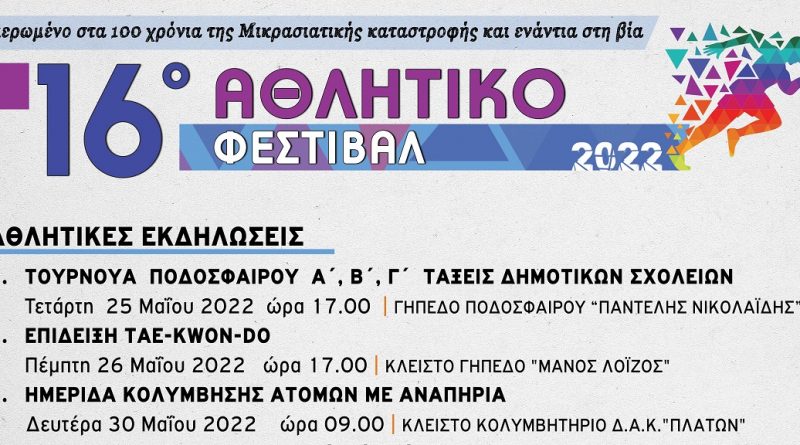 ΠερισσότεραΑθλητικές και χορευτικές εκδηλώσεις περιλαμβάνει το 16ο Αθλητικό Φεστιβάλ της Διεύθυνσης Αθλητισμού του Δήμου Νίκαιας – Αγ.Ι.Ρέντη, το οποίο είναι
