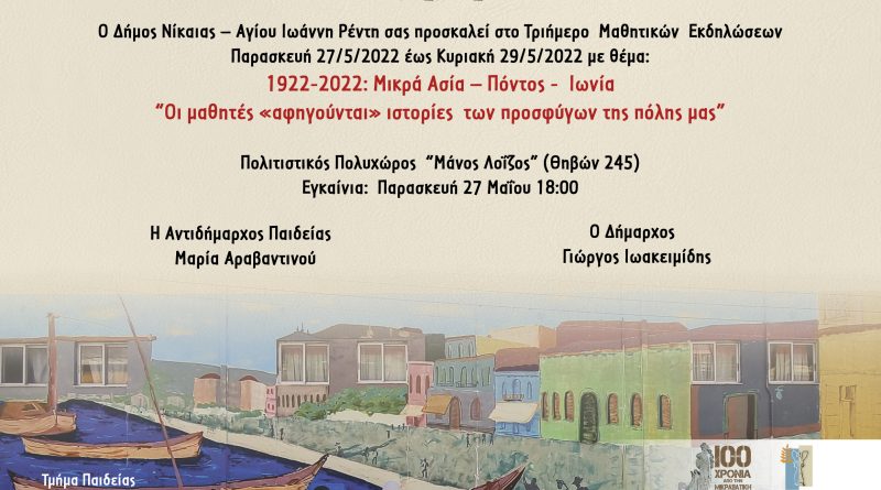 ΠερισσότεραΤΡΙΗΜΕΡO ΜΑΘΗΤΙΚΩΝ ΕΚΔΗΛΩΣΕΩΝ 27-28-29 ΜΑΪΟΥ 1922-2022: Μικρά Ασία – Πόντος – Ιωνία «Οι μαθητές «αφηγούνται» ιστορίες των προσφύγων της πόλης